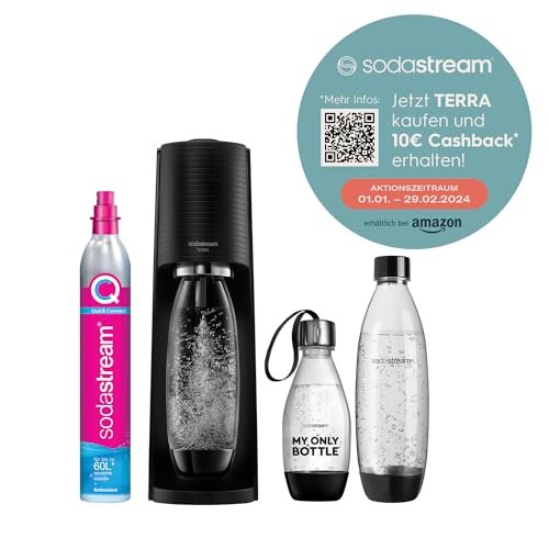 SodaStream Wassersprudler TERRA Promopack mit CO2-Zylinder und spülmaschinenfeste Kunststoff-Flasche, Schwarz, Höhe 44cm